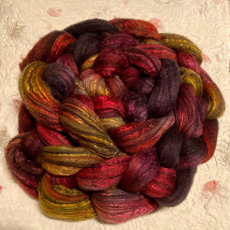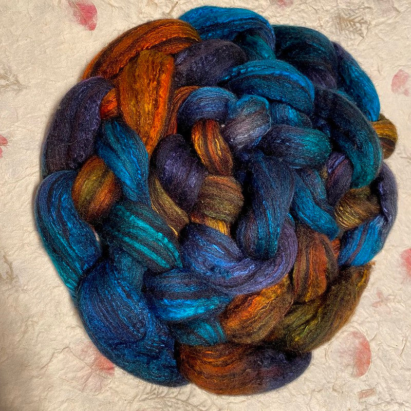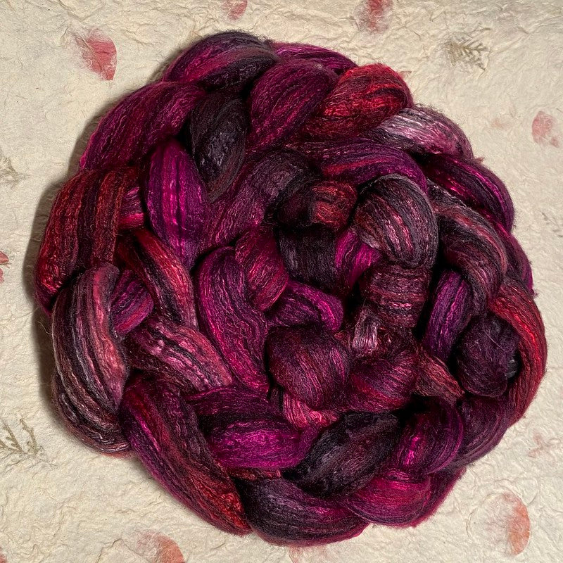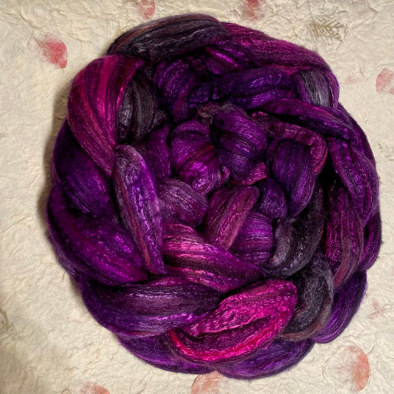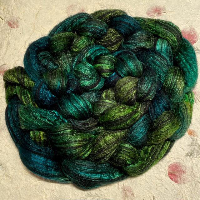 The perfect top to spin : sumptuous mulberry silk combined with deep black superfine merino, blended well together, to create a fabulous jewel-like yarn. Great to spin superfine as you can see in the little sample of the Emerald forest Nymph colourway I have spun in one of the photos (9 grams, 65 metres) or spin as a DK or chunky yarn. The effect of the lustrous silk combined with that deep black is the ultimate luxury yarn with an amazing depth of colour and shine.