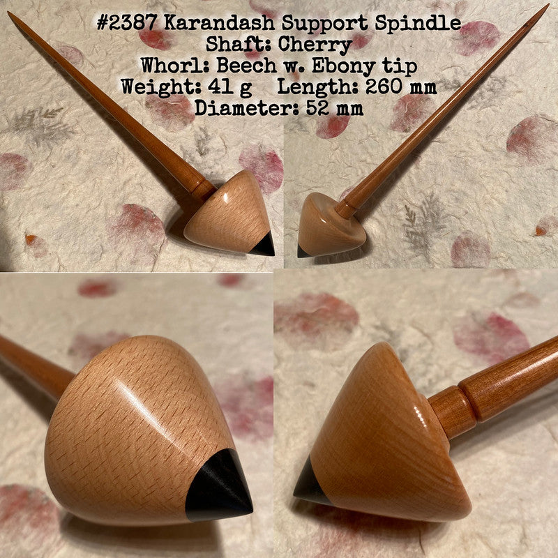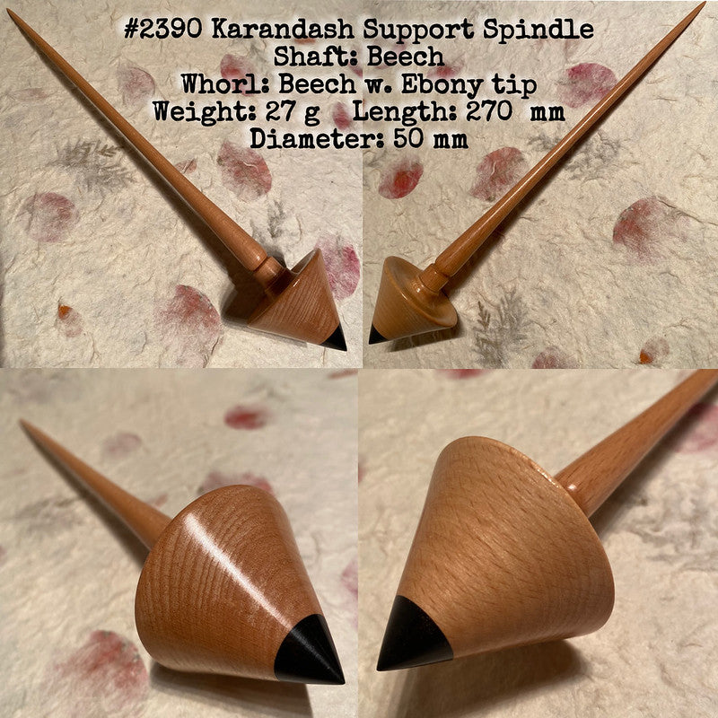 Karandash Support Spindles are a style of Russian support spindle where a whorl is positioned at the bottom of the shaft with a tip of another timber.