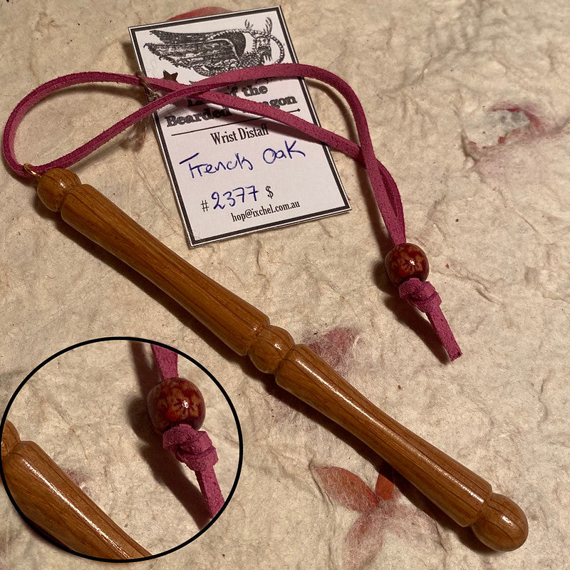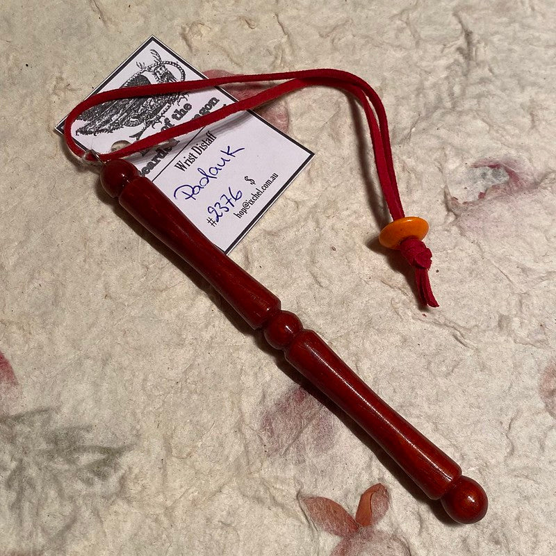 We use a variety of timbers and coloured leather straps and beads for these Wrist Distaffs. Each will vary slightly in weight and length but all generally are about 135/140 mm long, 9/12 mm wide and 8/12 grams in weight.  Please check individual photos for further details about the Distaff's available and refer to the drop down menu.