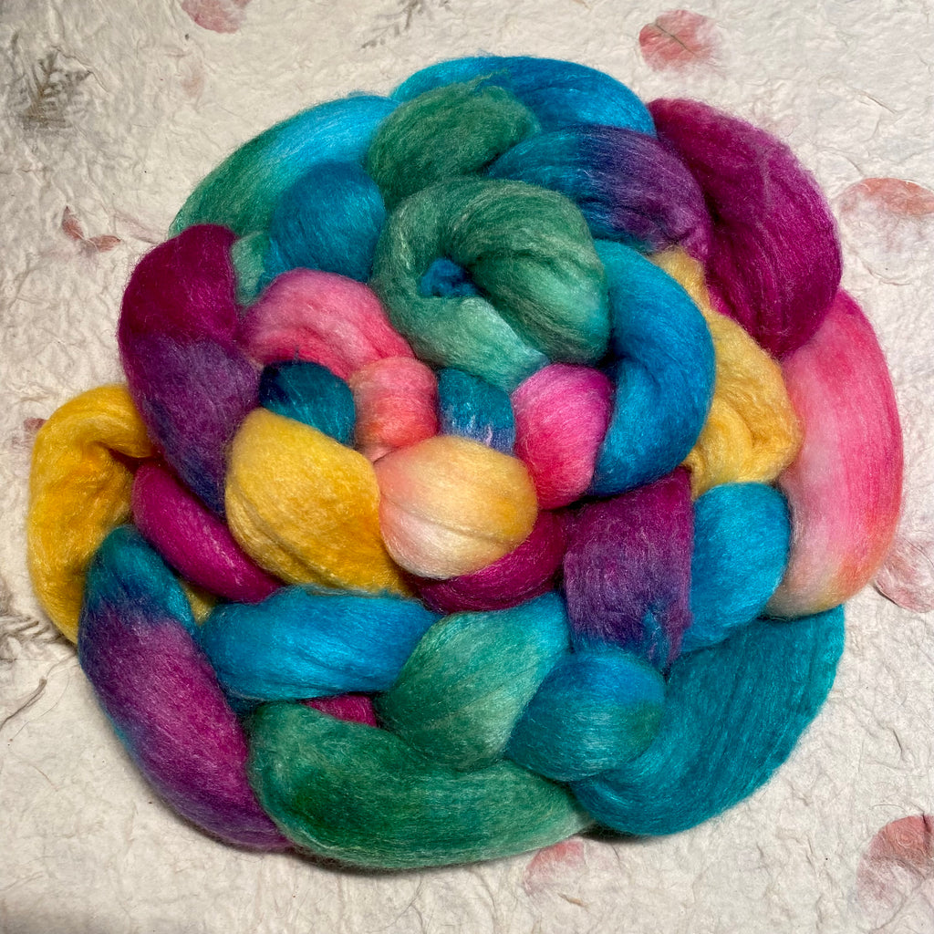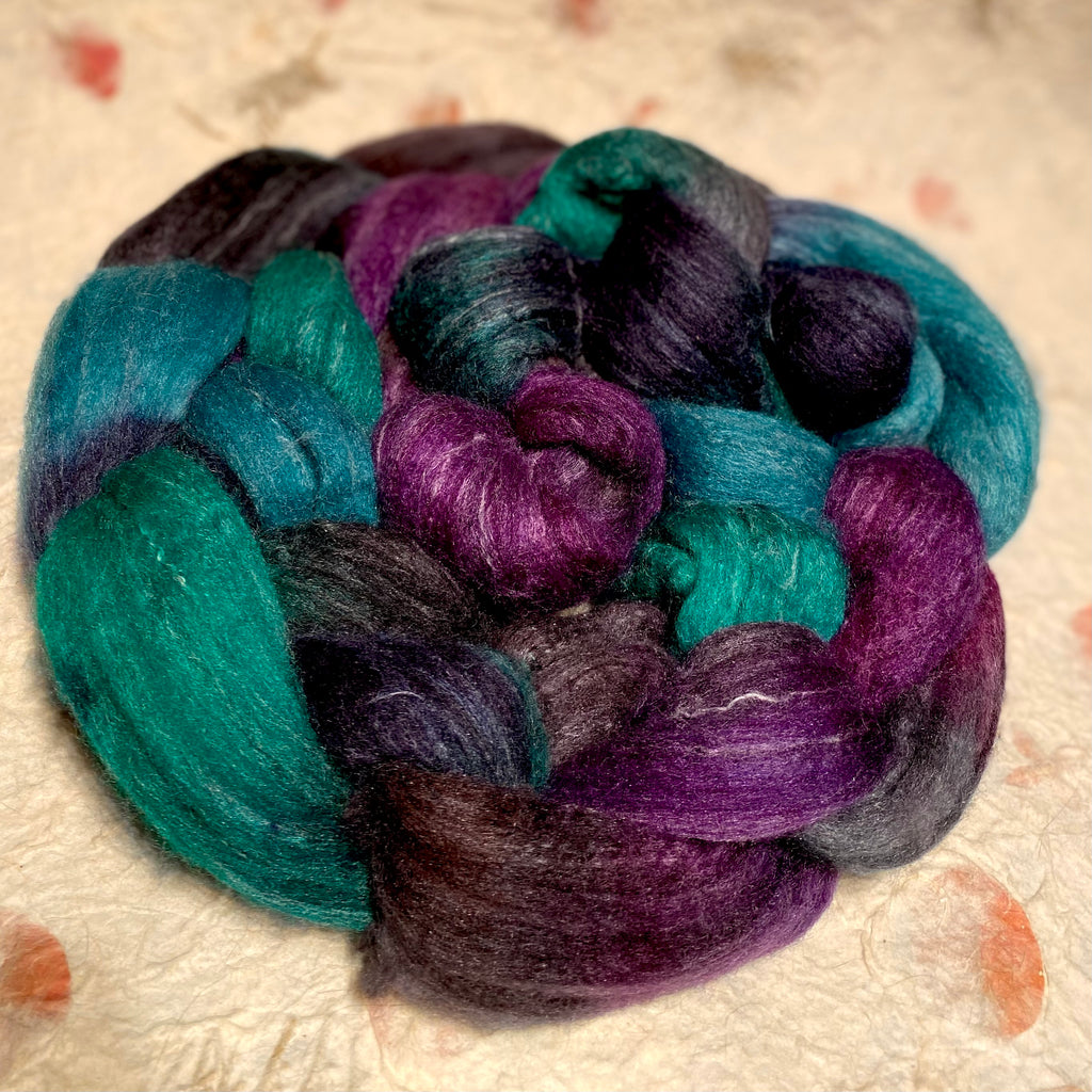 The blend spins up like a dream! It's a bit cool to the touch, has a gorgeous drape and feels very silky. Totally different from any blend with bamboo or soy or sea cell (seaweed) or even Tencel. This blend is perfect for making jumpers, as well as socks, since the tensile strength is huge and it also has excellent anti bacterial properties (it is great for combating sweaty feet and armpits).