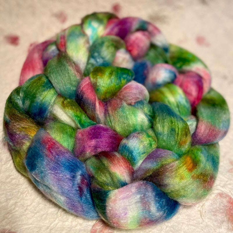 The blend spins up like a dream! It's a bit cool to the touch, has a gorgeous drape and feels very silky. Totally different from any blend with bamboo or soy or sea cell (seaweed) or even Tencel. This blend is perfect for making jumpers, as well as socks, since the tensile strength is huge and it also has excellent anti bacterial properties (it is great for combating sweaty feet and armpits).